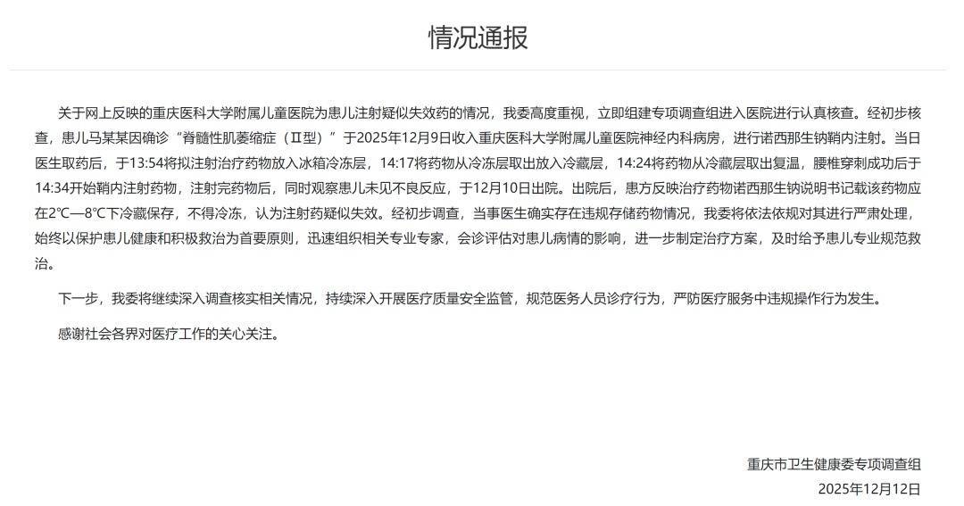 经初步核查,患儿马某某因确诊“脊髓性肌萎缩症(Ⅱ型)”于2025年12月9日收入重庆医科大学附庸儿童病院神经内科病房,进行诺西那生钠鞘内打针。当日医师取药后,于13时54分将拟打针调整药物放入雪柜冷冻层,14时17分将药物从冷冻层取出放入冷藏层,14时24分将药物从冷藏层取出复温,腰椎穿刺班师后于14时34分运转鞘内打针药物,打针完药物后,同期不雅察患儿未见不良反应,于12月10日出院。